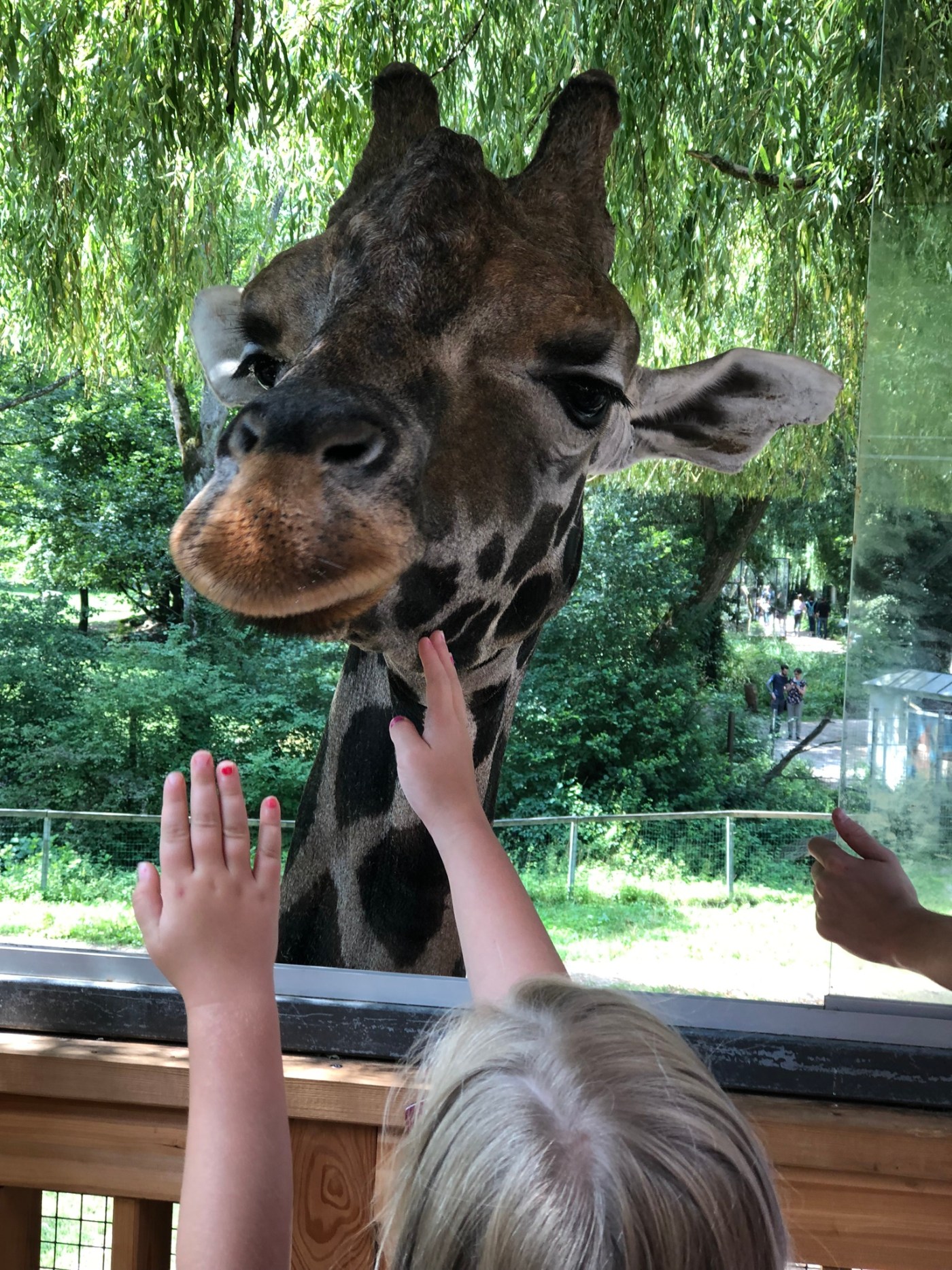 Unser erstes Highlight war die Fütterung der Giraffen. Eine Tierpflegerin öffnete ein Fenster am Aussichtsplateu und kurz darauf kam eine Giraffe daher und ließ sich von den Kindern füttern und streicheln.